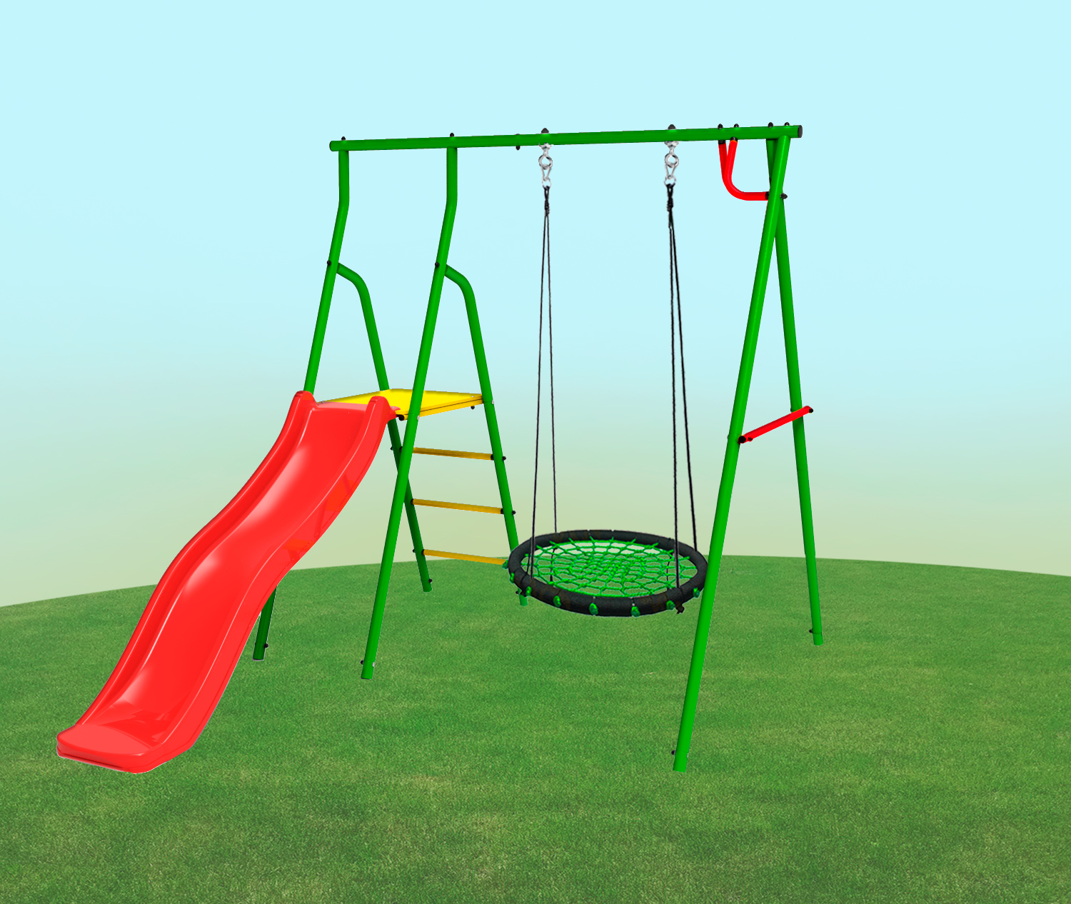 — Комплектация: горка пластиковая 1,6 м, подвесные качели-гнездо