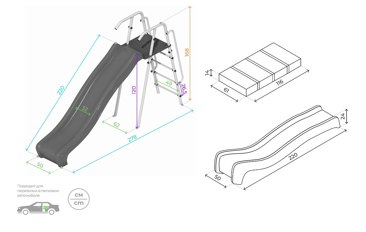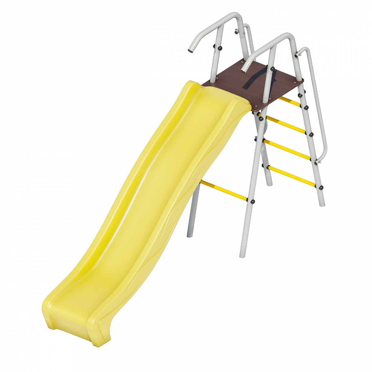 Высокая горка прекрасно дополнит игровую зону и обеспечит много часов веселых игр на свежем воздухе. Высота изделия – 1,67 м, длина – 2,7 м. Горка выполнена из качественных материалов: стали и пластика. Стальной каркас обеспечивает надежность и долговечность эксплуатации, а безопасный пластик обладает высокой прочностью и не выцветает на солнце. Изделие устойчиво к температурным изменениям и погодным условиям (дождь, снег, солнце и пр.). Горка не леденеет зимой и сильно не нагревается на жарком солнце. Бортики обеспечивают безопасность ребенка, защищая от падений, а обтекаемая форма горки без острых углов предотвращает ушибы и синяки. Поручни помогают забираться на горку даже малышам (от трех лет), с помощью маленькой лестницы можно обучить ребенка подниматься по ступеням и укрепить хват.