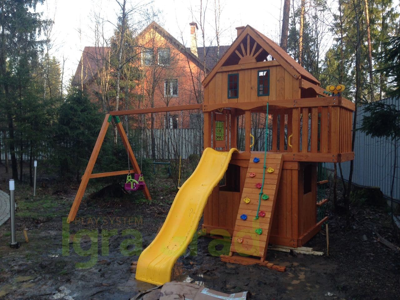 - двухуровневый домик с красивыми пластиковыми окошками зашитый снизу;