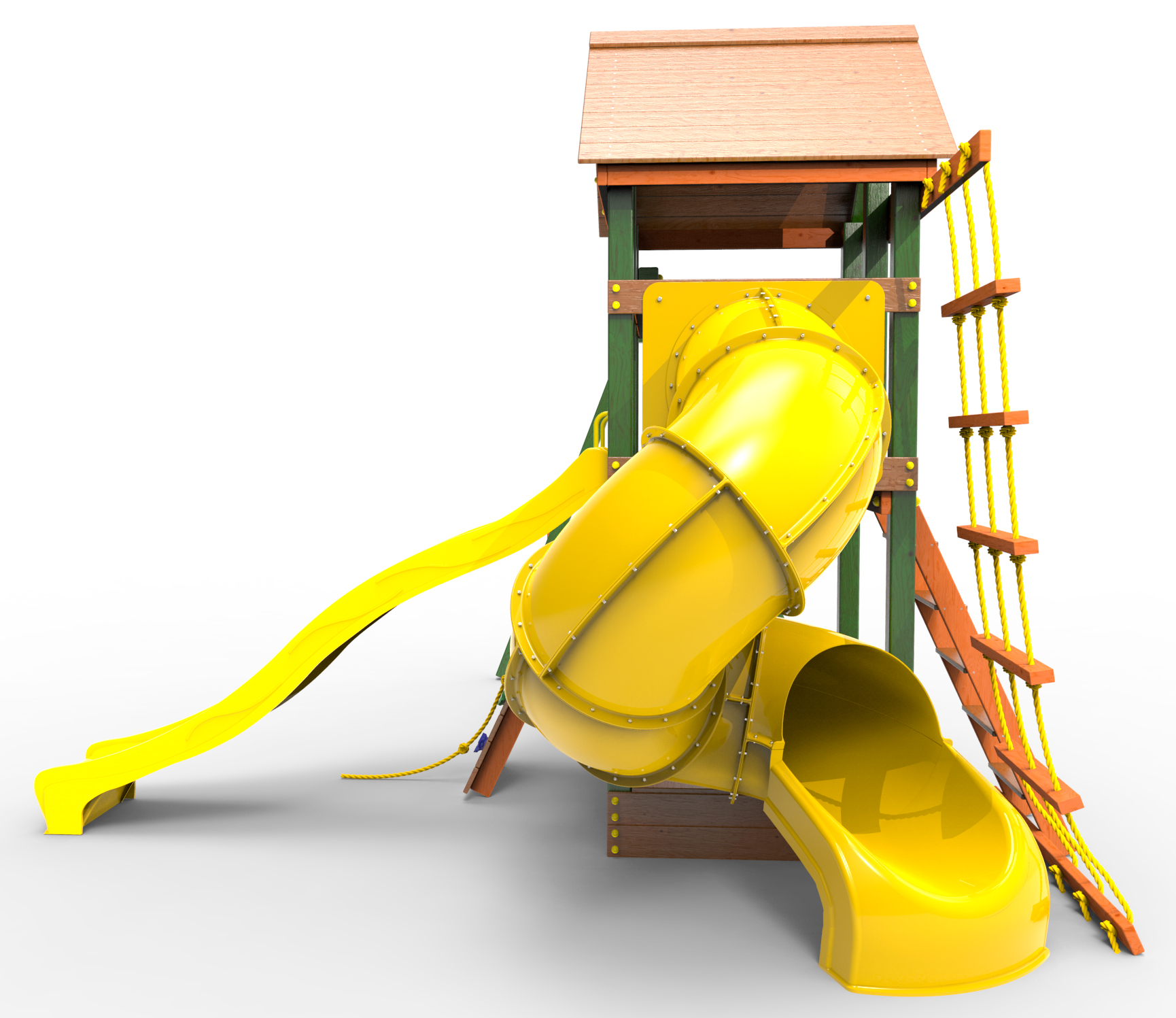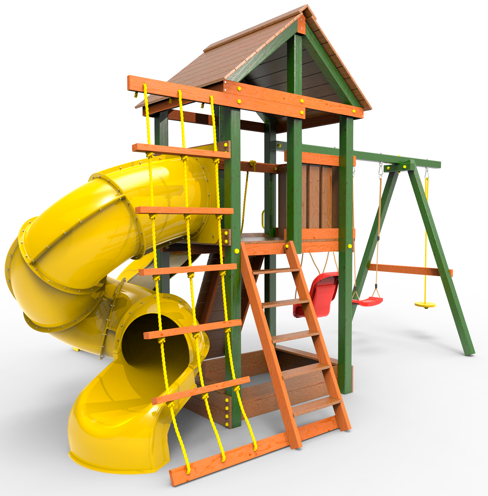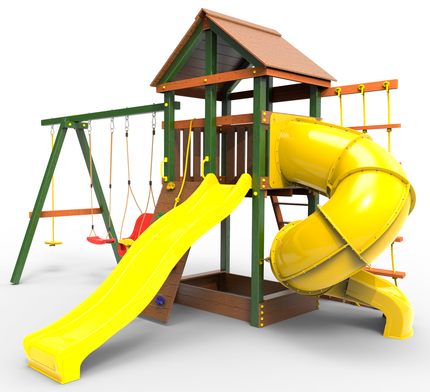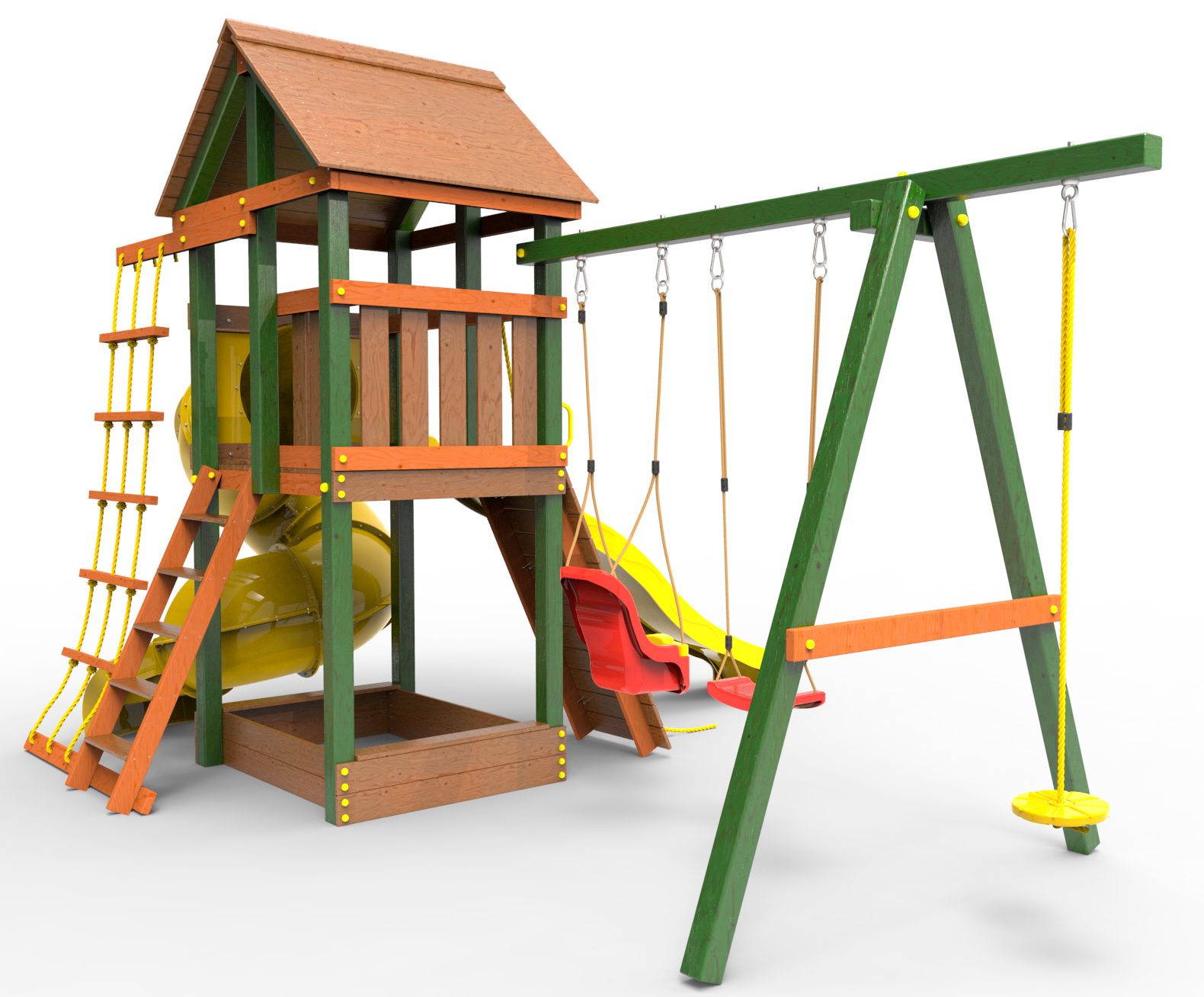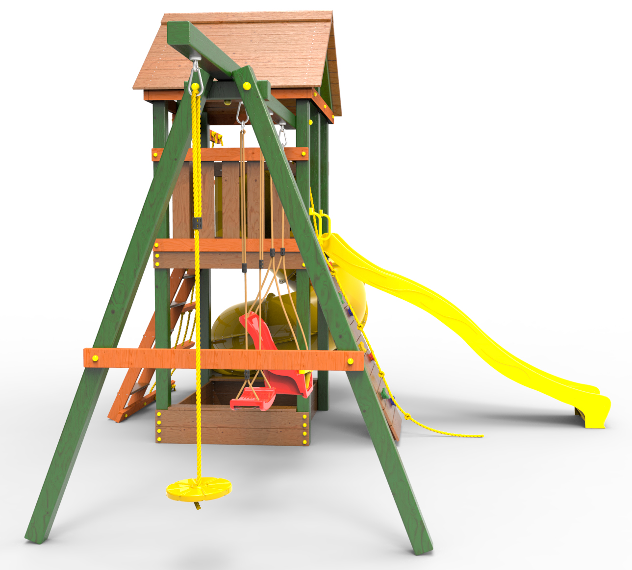 Детская площадка «Пикник Вега » представляет собой двухуровневую конструкцию, на первом уровне которой расположена песочница, а второй этаж представляет собой игровое пространство под деревянной крышей. Конструкция оснащена качельной балкой, повышенной прочности, которая имеет 5 креплений для качелей или любого другого навесного оборудования, шторм-трапом , двумя горками и скалодромом! .