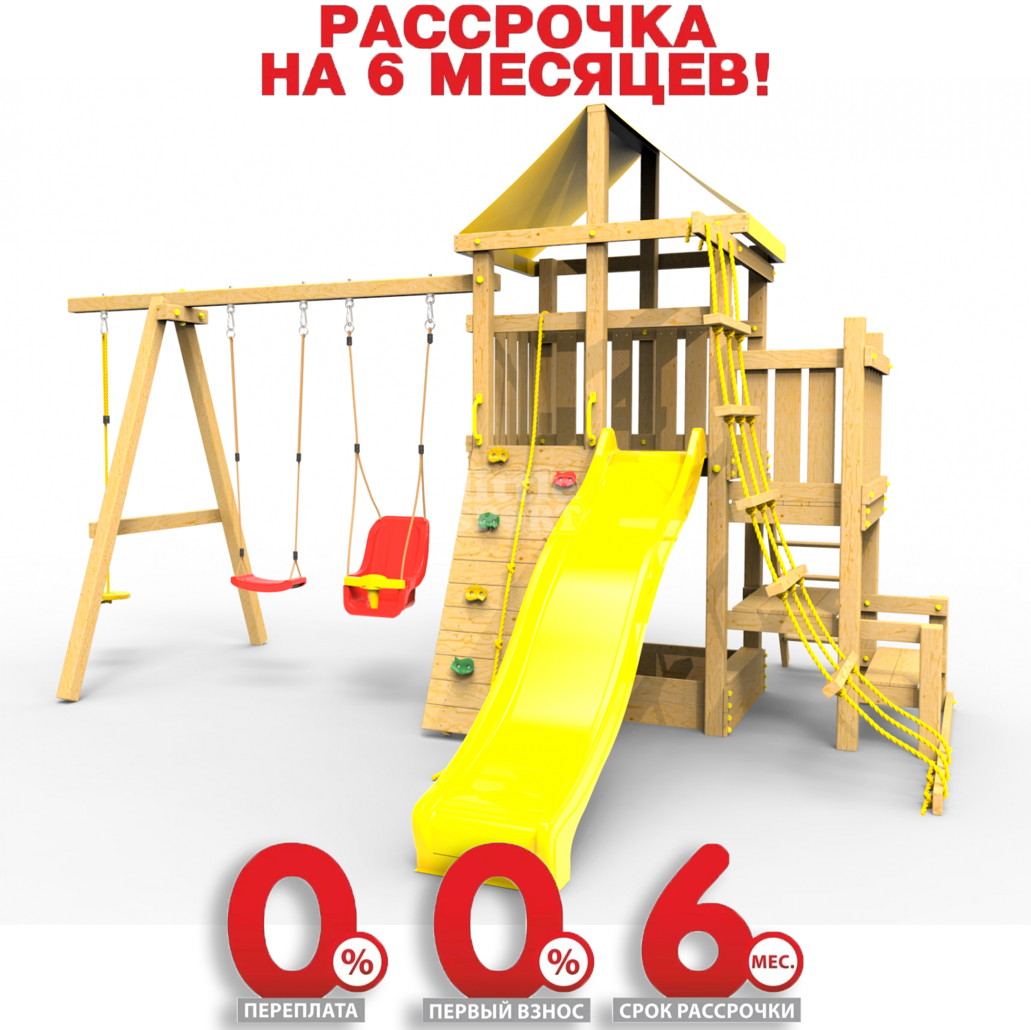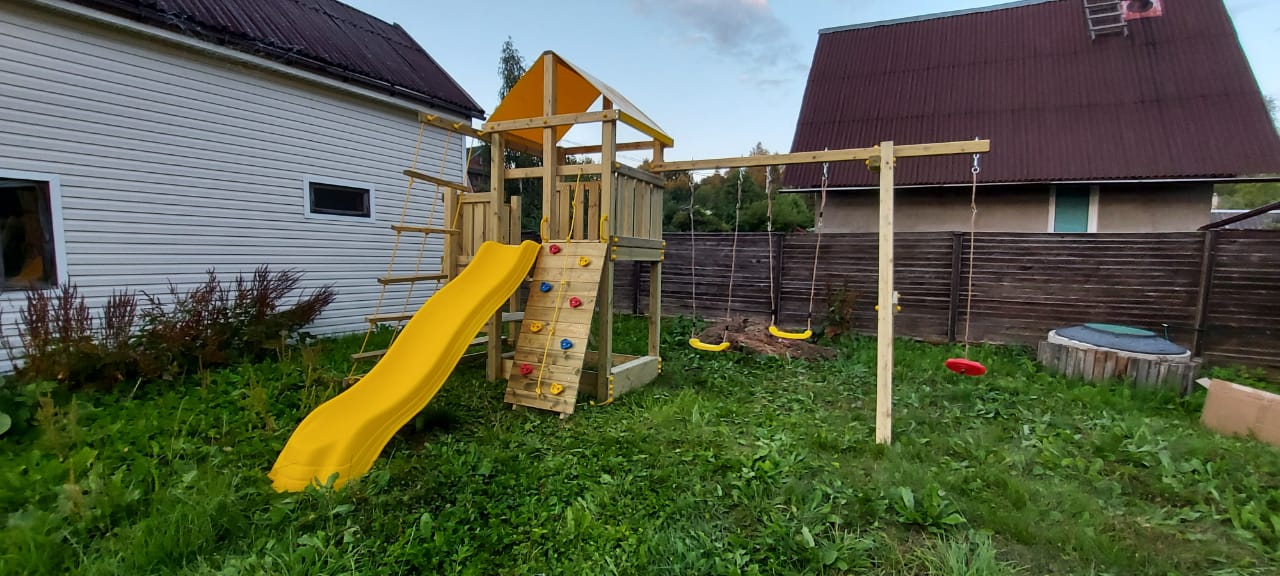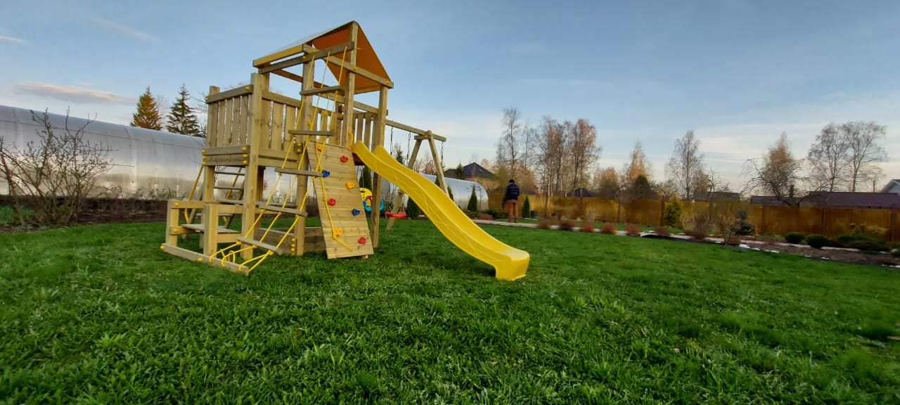 Обращаем Ваше внимание, что фактический цвет детской площадки может отличаться от представленных фото на сайте. Специфика окраски нетоксичными пропитками и красителями допускает отклонения в цветовой гамме отгружаемых изделий. Также обратите внимание, что фактический цвет может отличаться из-за цветопередачи устройства на котором Вы смотрите фото.