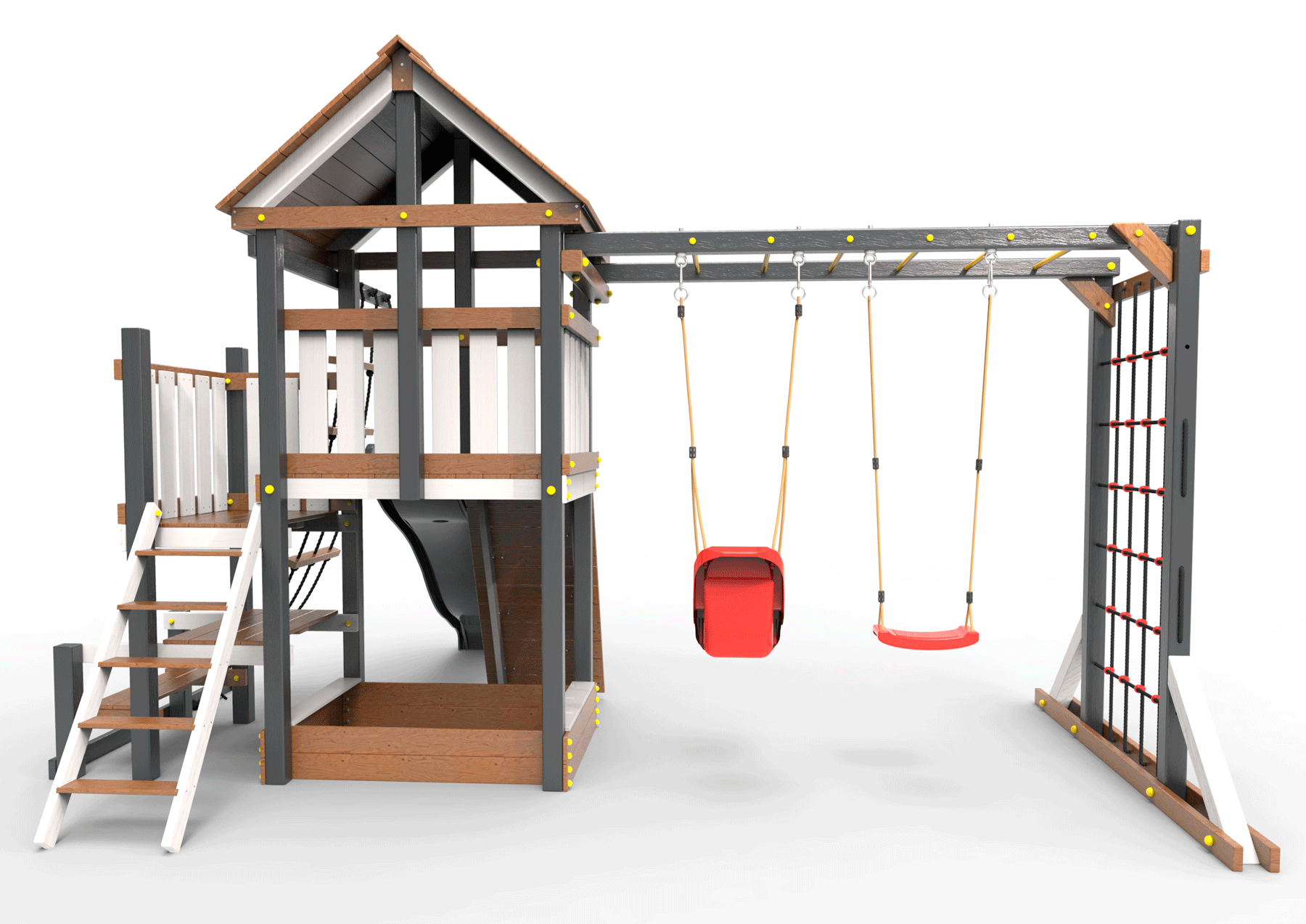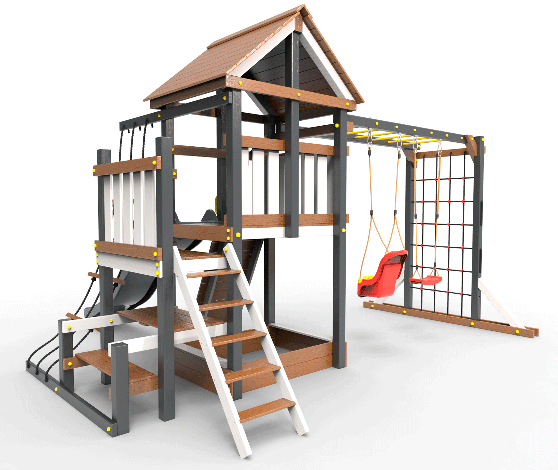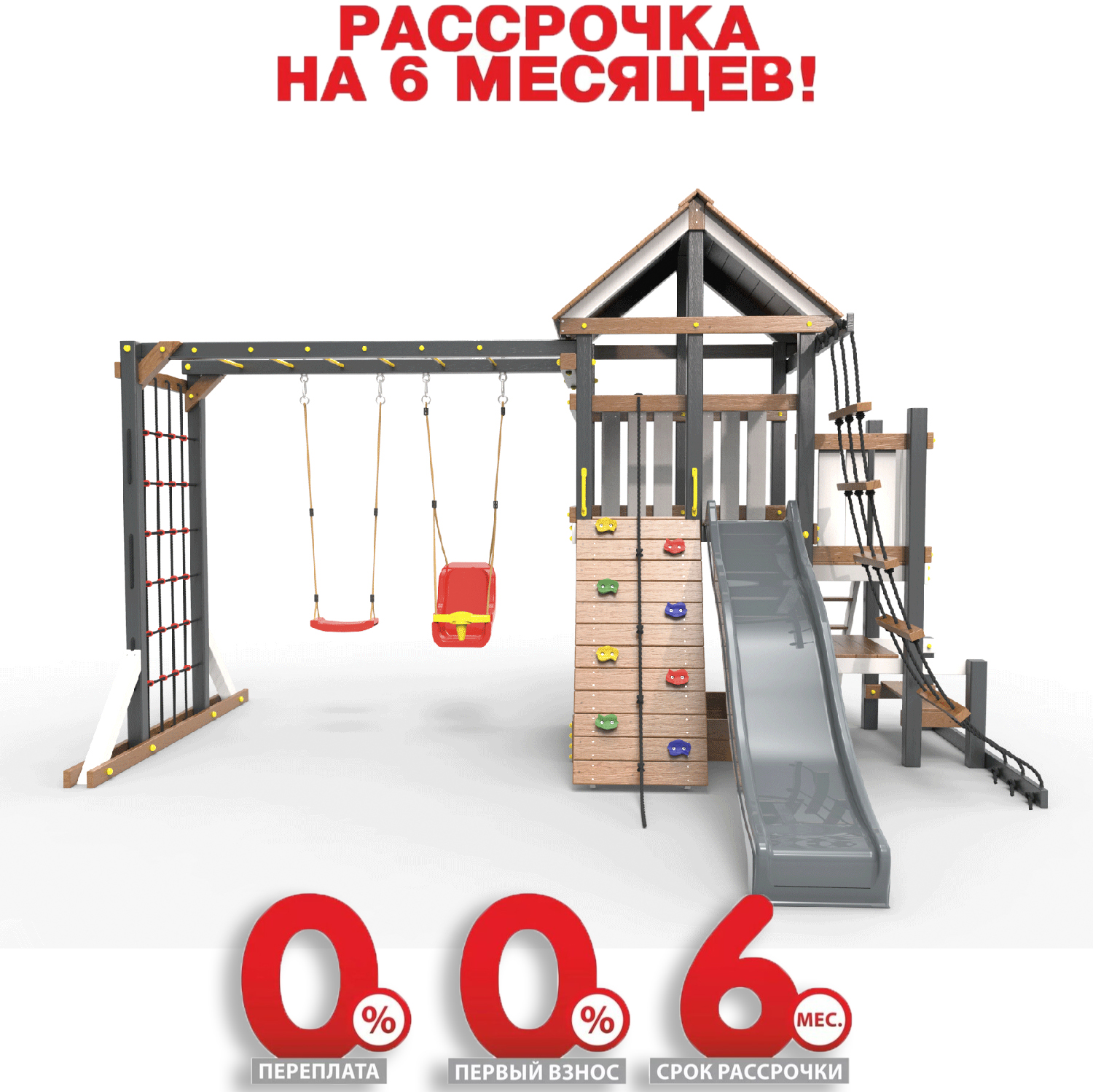 Обращаем Ваше внимание, что фактический цвет детской площадки может отличаться от представленных фото на сайте. Специфика окраски нетоксичными пропитками и красителями допускает отклонения в цветовой гамме отгружаемых изделий. Также обратите внимание, что фактический цвет может отличаться из-за цветопередачи устройства на котором Вы смотрите фото. Производитель оставляет за собой право менять цвет отдельных деталей и комплектующих(включая пластик, канаты и пр.), при этом сохраняя весь функционал и характеристики товара.