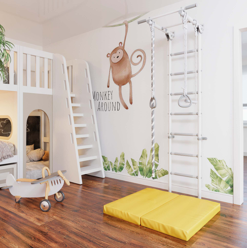 Пастельный цвет ступеней гармонично сочетается с серым корпусом, спортивный уголок стильно выглядит в любом интерьере.