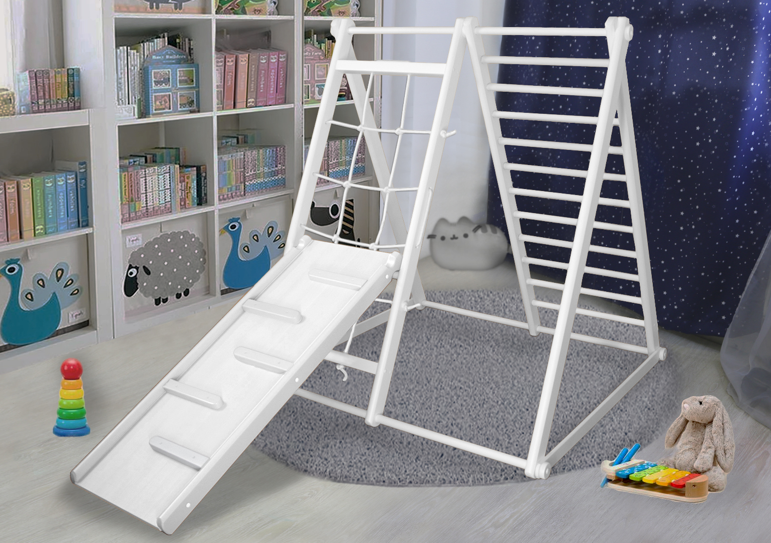 Универсальная складная компактная конструкция выполнена из натурального дерева, все края деталей немного скруглены обеспечивая большую безопасность для ребенка.