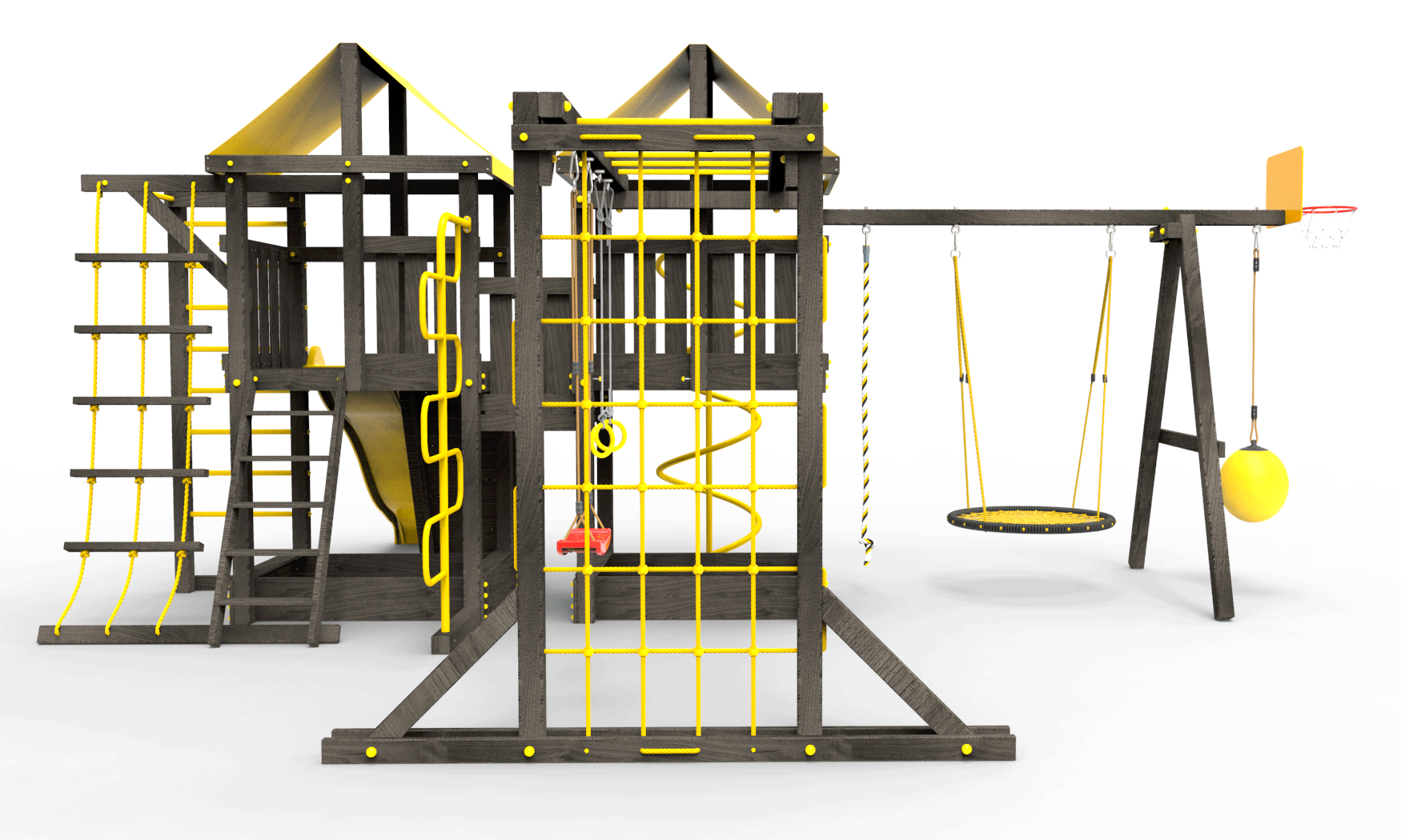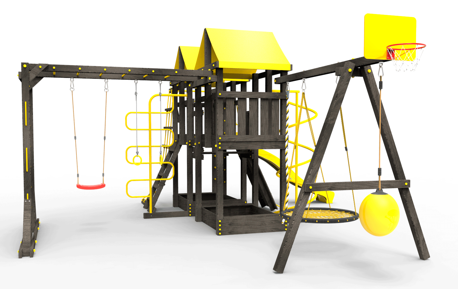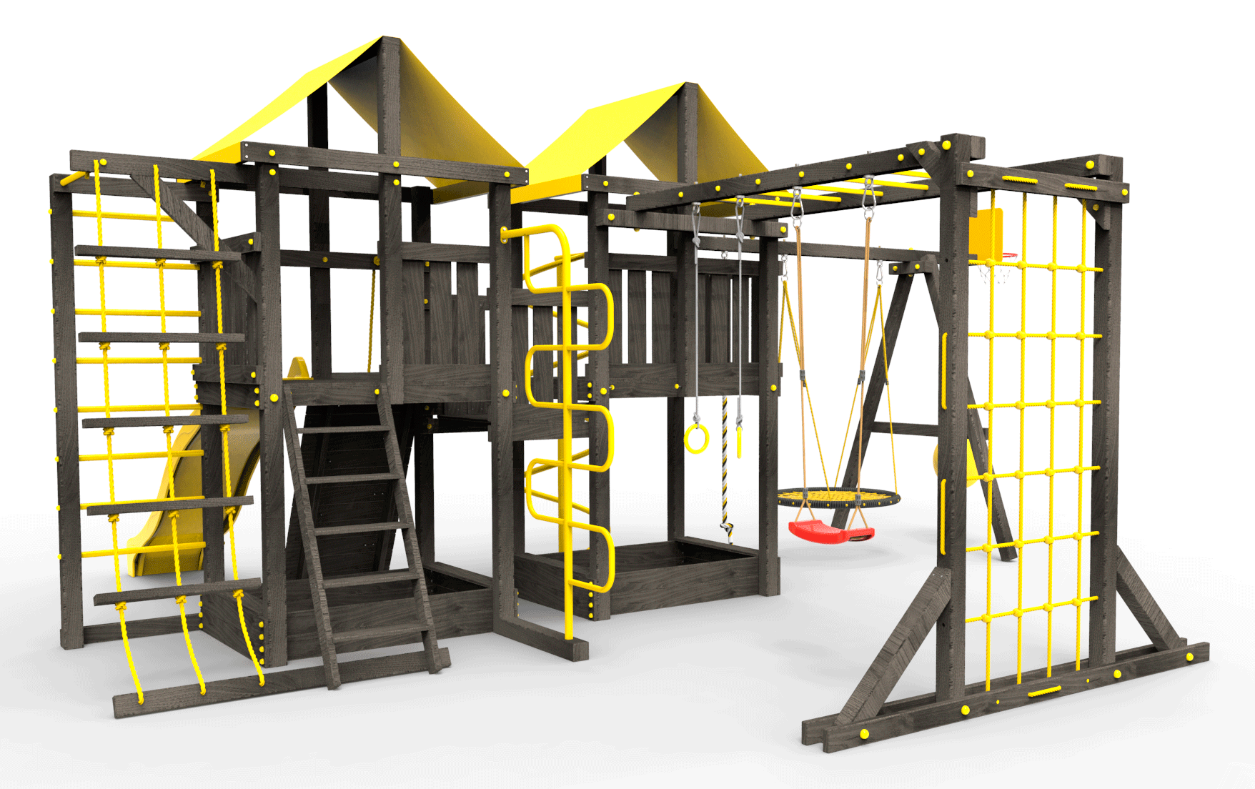 Все столбы и качельная балка площадки выполнена из высокопрочного клеёного бруса камерной сушки сечением 90х90мм.