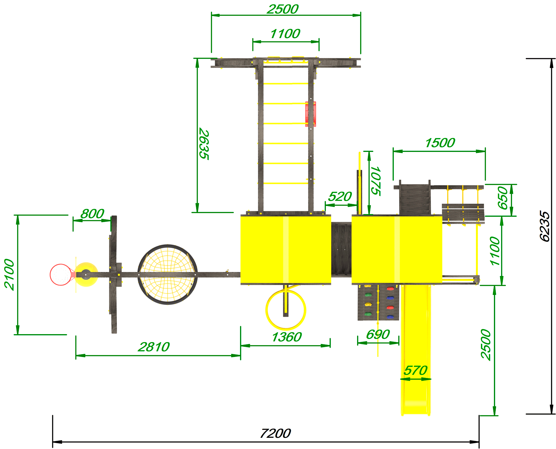 занимаемая площадь для свободного передвижения и игр – 8х7 метров.