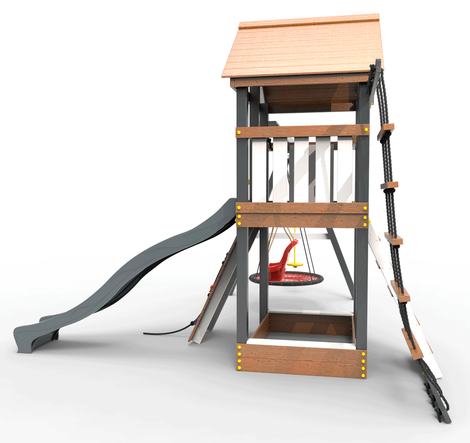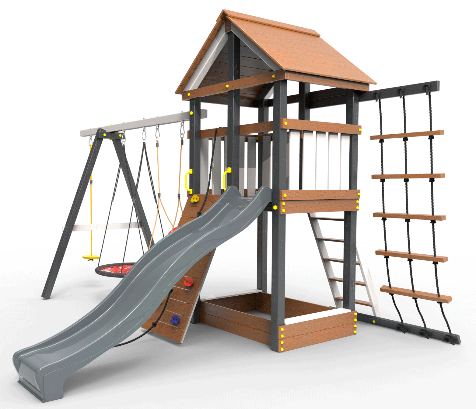 Детская площадка «Пикник Ультра 2.1 » является одной из вариантов комплектации флагманской модели "Ультра" и представляет собой двухуровневую конструкцию, на первом уровне которой расположена песочница, а второй этаж представляет собой игровое пространство под деревянной крышей. Конструкция оснащена качельной балкой, повышенной прочности, которая имеет 5 креплений для качелей или любого другого навесного оборудования, шторм-трапом ,горкой и скалодромом! .